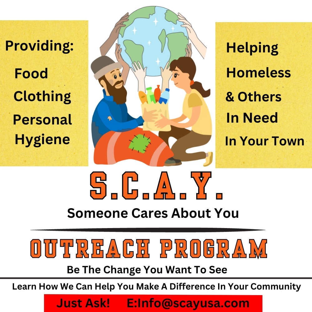 At On The Fence, LLC, a multi-media company, our outreach program S.C.A.Y. (Someone Cares About You) provides and inspires you to provide basic necessities to those in need in your community such as clothing, water, food, other goods and, a friendly interaction.