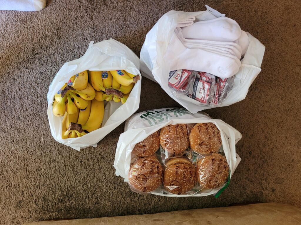 I started with peanut butter & jelly sandwiches, bananas, and bottles of water.