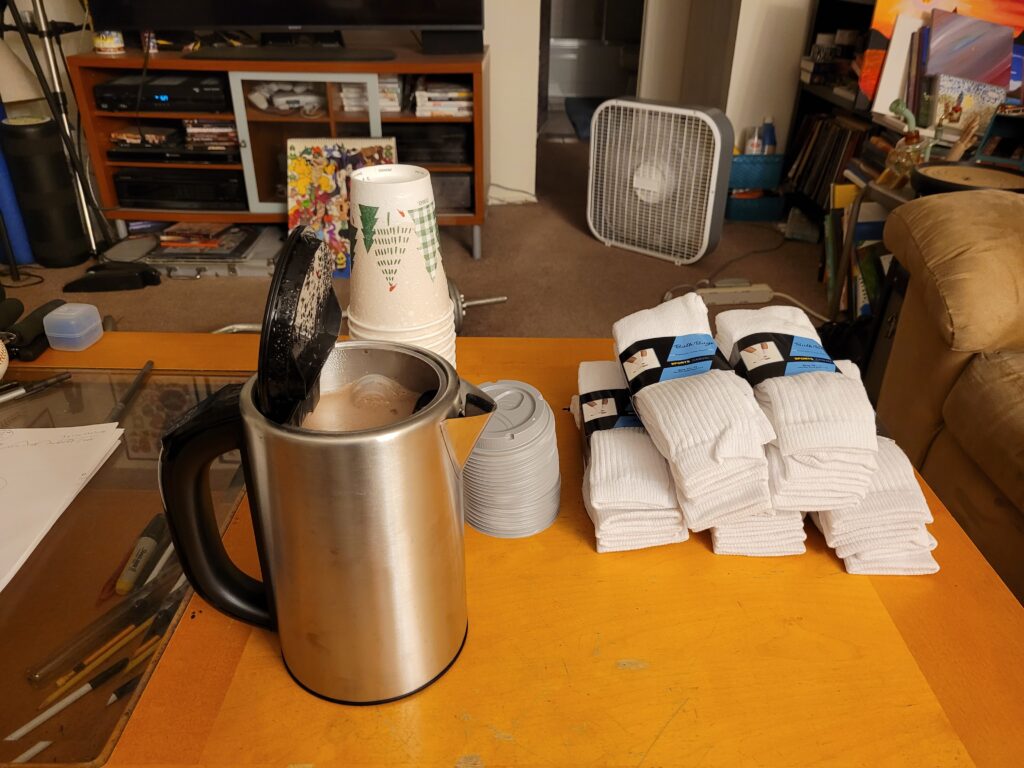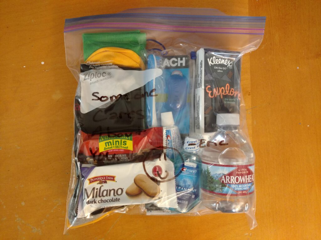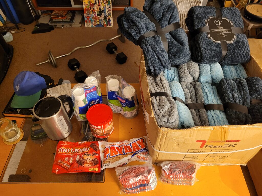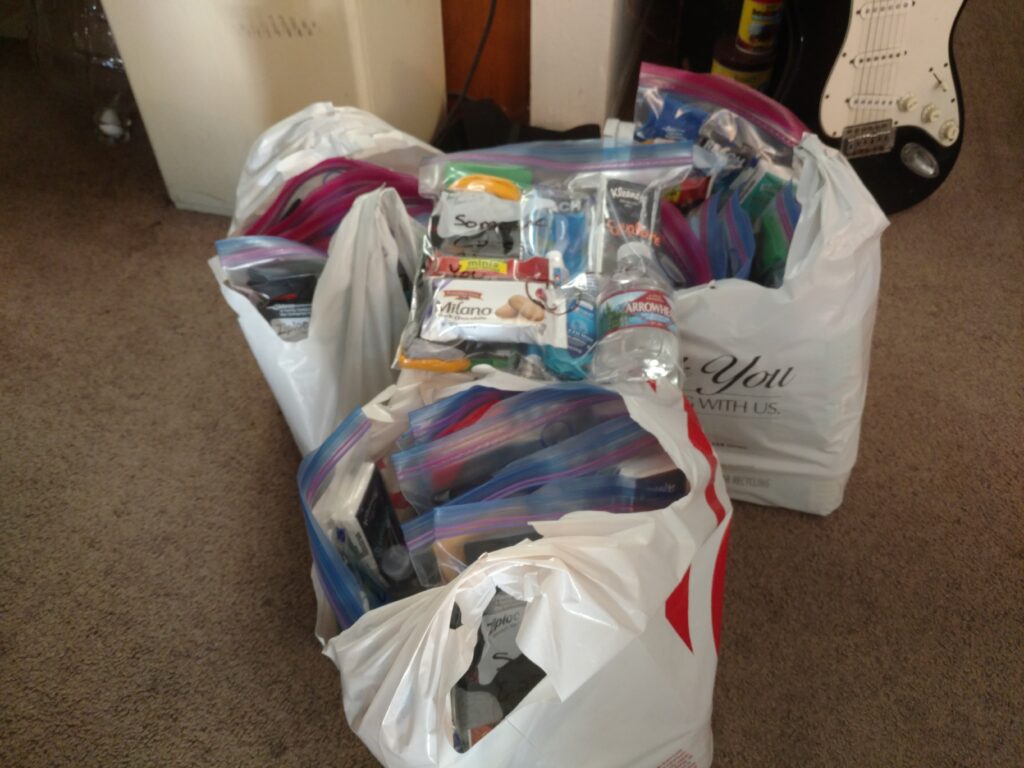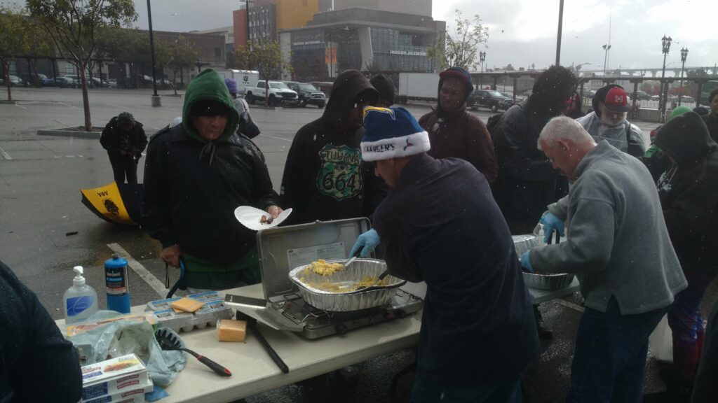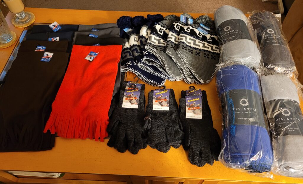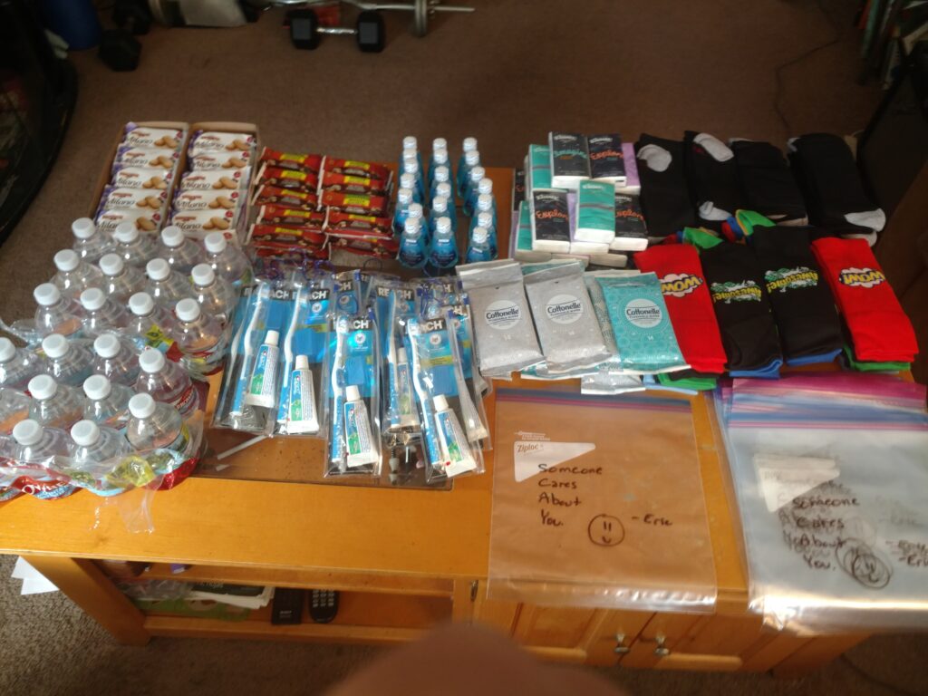 We gathered donations of clothing and food from our family and friends and chipped in money to buy eggs, bacon, bread, coffee, hot chocolate, and bottled water.