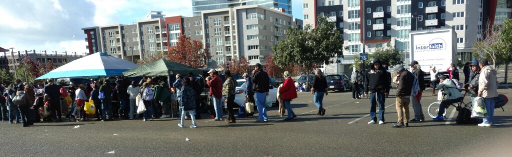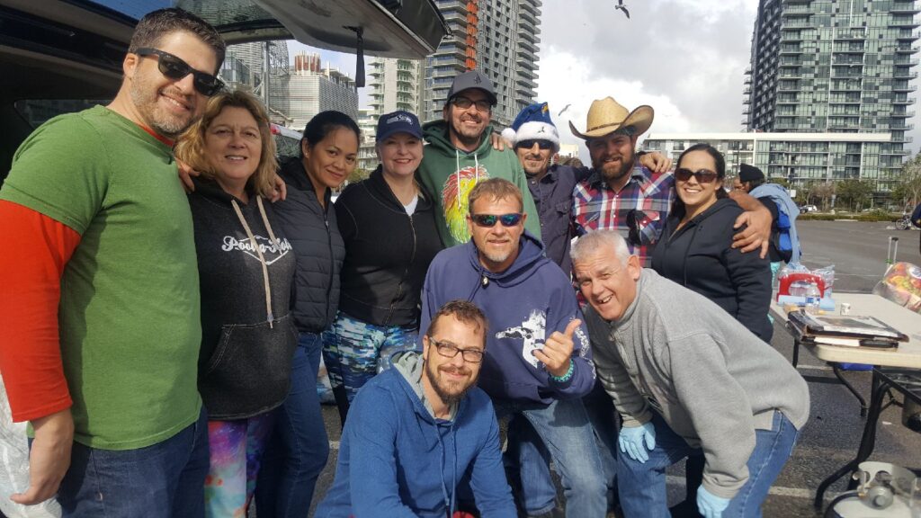 We gave away food, clothing, and good cheer for major holidays at the San Diego Ace Parking lot by PetCo Park.