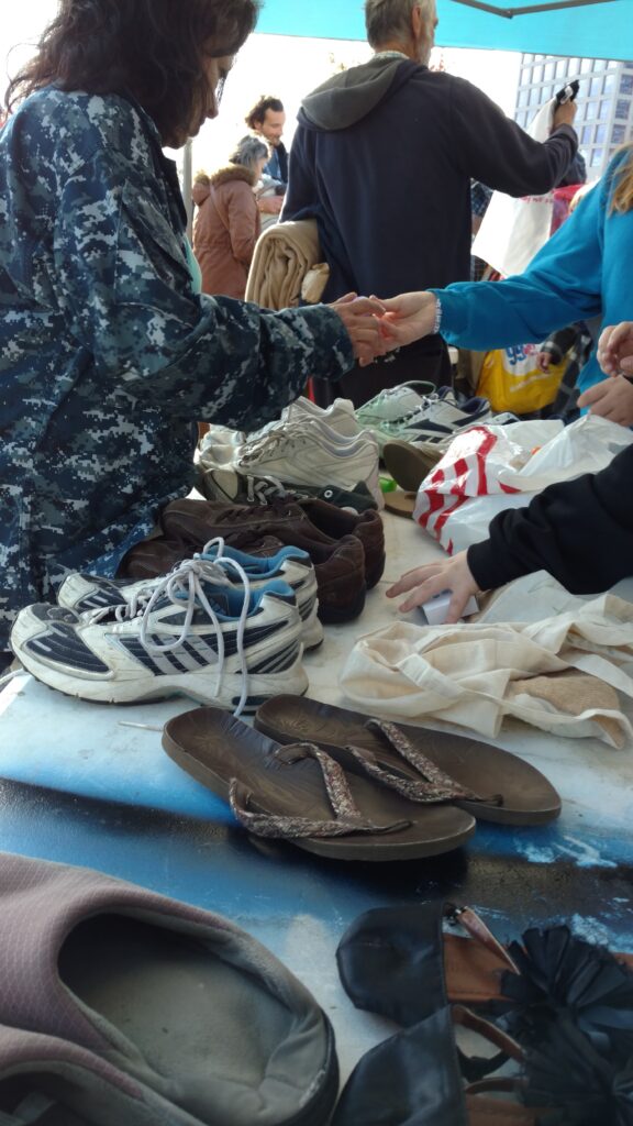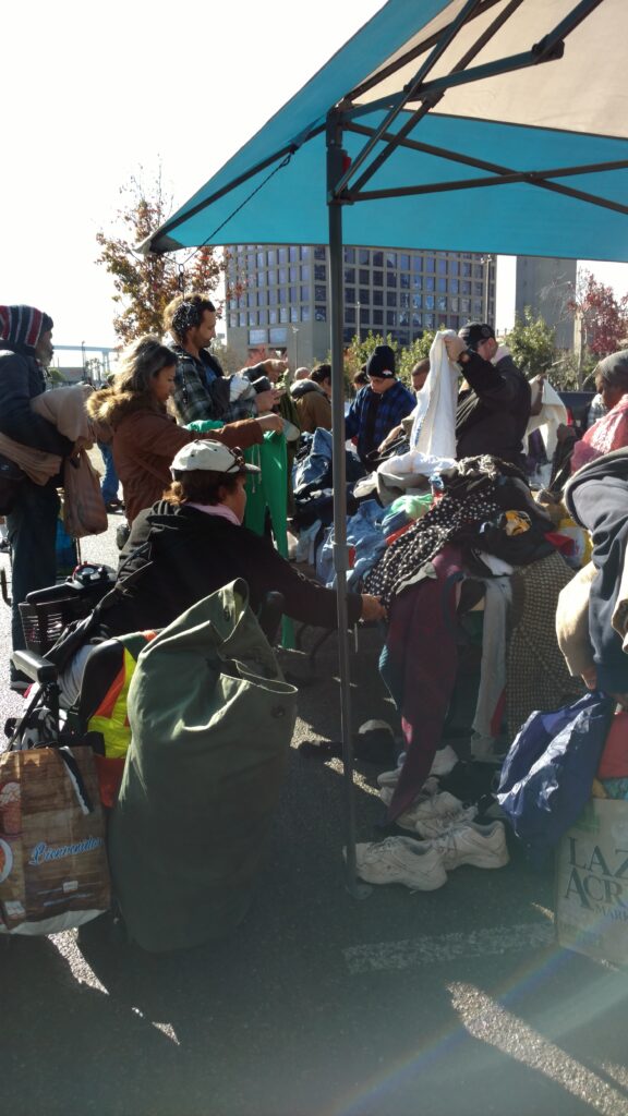 We met at the Ace Parking Lot or Homeless Shelter in downtown San Diego at a specified time and set up five or six tables separating the food from the clothing.